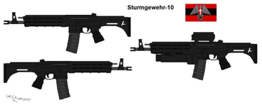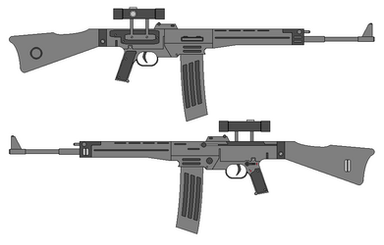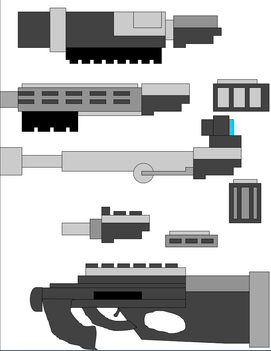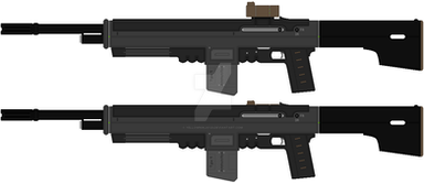 As the successor to the long-running S35 series of gas-operated rifles, the S36 was designed very much in the S35's image so troops who had been trained with the S35 would be more familiar with the new weapon. Internally however, the S36 was very much different. Instead of gunpowder, the S36 utilised electromagnetic rails to propel 5.56x45mm tungsten-carbide armor piercing microexplosive rounds at hypersonic speeds giving it far more penetrating power and range than its predecessor. Without bullet catridges, a S36 rifle magazine could also load more rounds with the extra space, increasing the ammunition capacity from 30 to 50 rounds. The rifle magazine also carried the compact energy cell that powers the rifle's electromagnetic rails. Much like the S35, the S36 had tactical rails on the upper receiver as well as on the bottom of the handguard for various attachments, ranging from scopes to laser sights and grenade launchers. A standard favourite configuration remained as the classic holo-sight on top, and an underslung 40mm grenade launcher on the bottom for extra firepower.