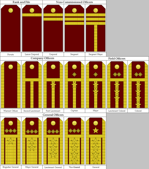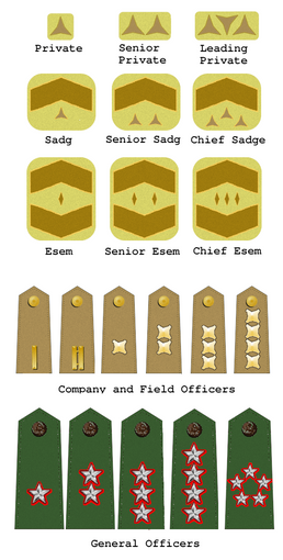 RANGSI government officials exist as two distinct parallel rank categories. These are Governors and Specialists. Governors are groomed for broad leadership roles and have vision, but not necessarily the specific expertise and experience to accomplish this vision. This specific expertise is then supplied by Specialists, bureaucrats who head specialised departments and serve as the Governors’ advisors. In 21st Century military terminological terms, Governors are akin to officers while Specialists are the NCOs. While encouraged to be kept separate, crossing from one track to another does happen and is possible either upon personal request (which, alone, is discouraged because it would mean restarting from the lowest rank) or by a superior’s recommendation-slash-appointment.As expected from a militaristic society of conscripts and reservists, rank is given special emphasis in political life and it is not surprising that the government basically operates like the military just without arms, with its focus on hierarchy and the ‘chain of command’. RANGSI is also probably among the only few nations in the galaxy whose civilian government has actual military-style ranks that they display on shoulder boards. RANGSI government uniforms are also not at all too dissimilar from military dress uniforms.