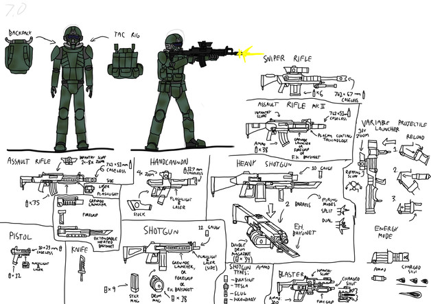 The life of an infantry grunt isn't easy, even in the space age. Some of the notable equipment carried by RANGSI riflemen include:1) S36A1+GL Auto-Railgun