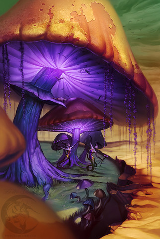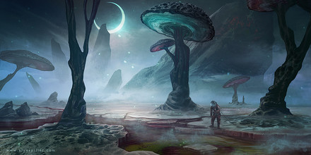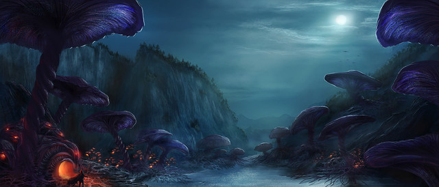 well, this is a wonderful planet. your leading lines are strong, and the scale differences are breathtaking, and the foreground to background is real solid work. its quiet. like looking through a window. you did perfect with the blue spores leading to the sky jellyfish on the right. a unique vision.