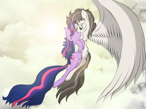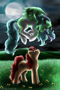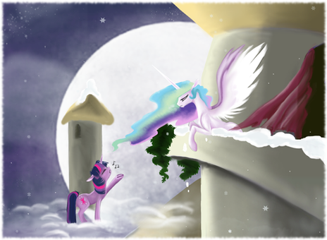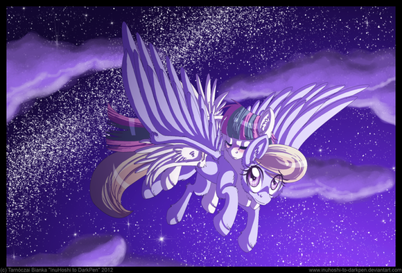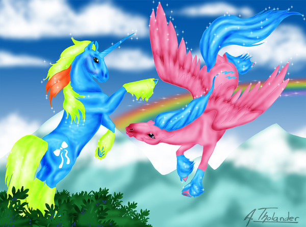I'm the pony (Dreamstar), with the halo, the higher pony, while , Windsong, is the one flying upwards.