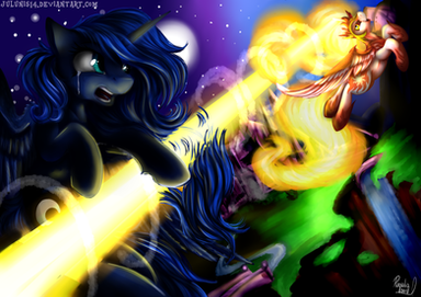 Anyway, this shows 's ponysona Wild Fire, breaking the barrier and startling my ponysona, Dreamstar, as she screams past.