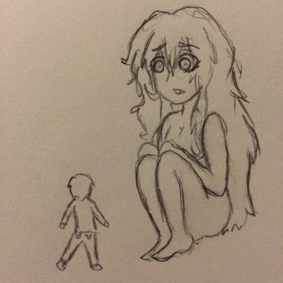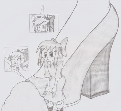 Well this is a pic i just did from something i thought up long ago. Its about this girl that finds herself in a giants house with her pixie like friend who is shorter than her and can jump really high. anyway, the giant is gone so she walks into his house wondering what its like and all that. Her friend runs around leaving the girl alone. Well she looks around by herself and suddenly the giant comes back after forgetting something. The girls hides under the table very freaked out hoping her friend isn't spotted. she realizes the Giant is around the same age as her.Her friend runs passed and into the other room up the stairs. The girl goes after her friend and gets spotted by the giant. He looks back thinking she was a mouse, since her hair is silver. The girl falls to her knees realizing the stairs are too big, then she feels the earth shake and she turns around to see the giant staring right at her.