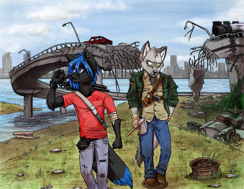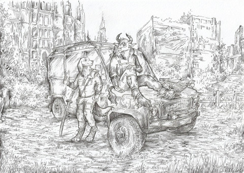 #anthro #anthrodog #apocalypse #border #bovine #building #bull #canine #car #city #cloudy #collie #crossbow #dog #field #friends #furry #furrydog #katana #male #ruined #vehicle #anthrobull #anthro_dog #furrybull #apocalypseart #furry_dog #furrybordercollie #bordercollie #traditionalart