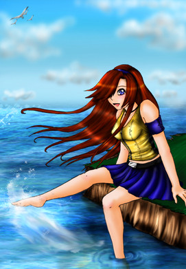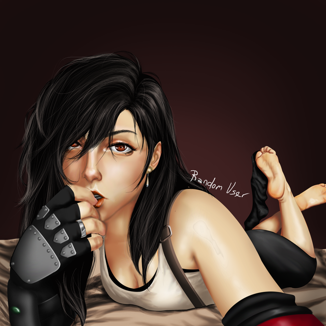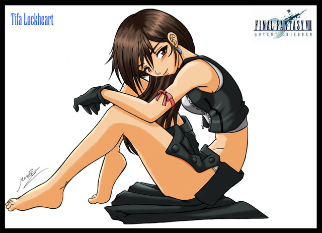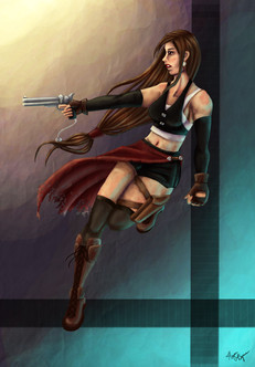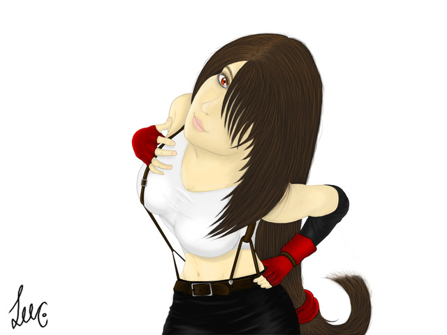 Tifa Lockhart is a female protagonist from the Final Fantasy universe but most recognized from Final Fantasy VII. She is an expert in Zangan-Ryu martial arts and uses her fists and feet as her weapons. Tifa has long, dark brown hair with the ends parted like a dolphin's tail, a large bosom, and deep brown eyes. Bright and optimistic, Tifa always cheers up others when they are down. But don't let her looks fool you, she can decimate almost any foe, that gets in front of her fists.Drawn: Photo shop 7