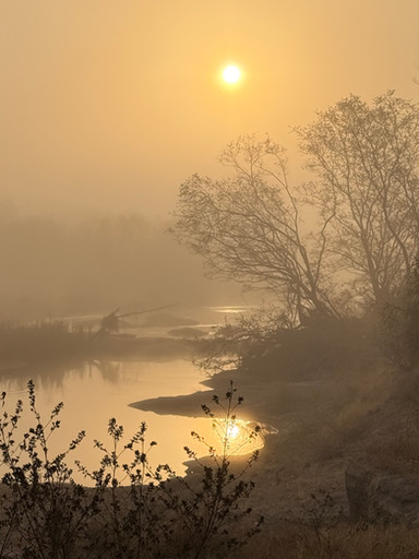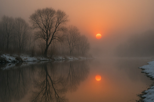 #autumn #fog #reflection #river #sun #tree #water