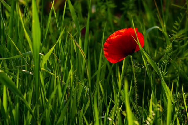 Outstanding use of depth of field, colors, and composition. That touch of red among the green with highlights all around, simply beautiful.