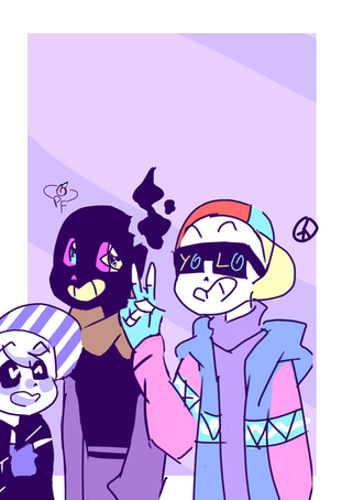 Just Fresh visiting his little Jammy with a protective mama (Ink) watching over them, Error is there but hes doesn't give a fuck just sewing up a new sans doll outside the frame Β