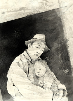 Pencil, some charcoal - and edited in photoshop. Just used some standard round brushes with variations in the opacity.