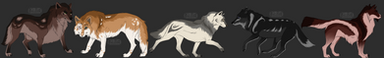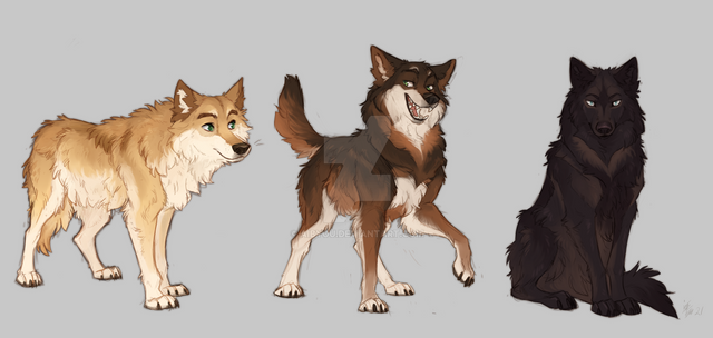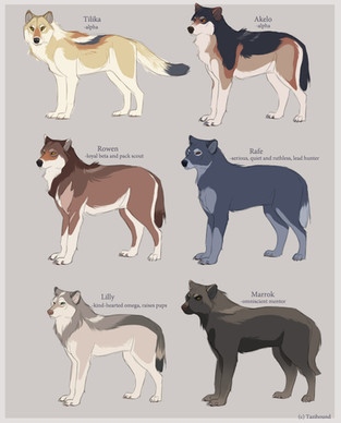 These are some really nice designs! Your drawings are very fluid, soft and beautiful. It's difficult to draw four legged animals (especially wolves) without making them look too stiff. Very nice, this caught my attention right away. If I were to critique one thing though, I think your character designs would be heavily enhanced if you altered each wolf's eye shape to fit with its personality. If you look at the eyes of the first three wolves, they look like they have the same eyes but with different colours, plastered onto different faces... If you know what I mean. I dunno, just my opinion I suppose, give or take. ^^