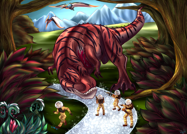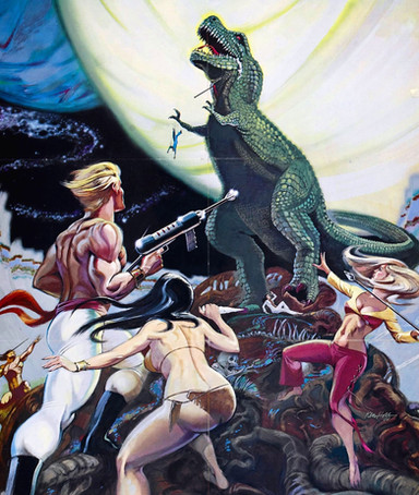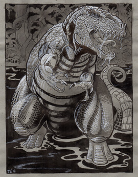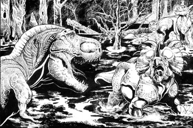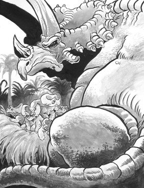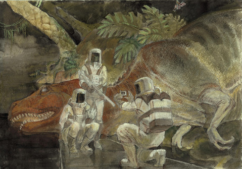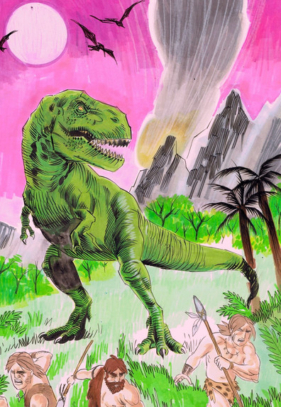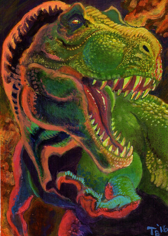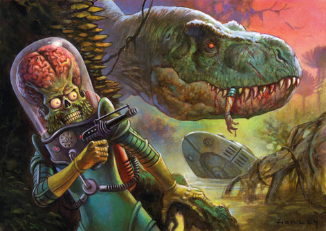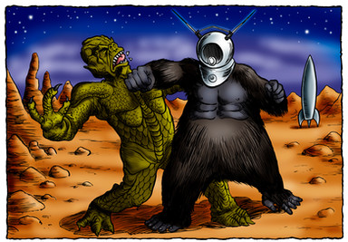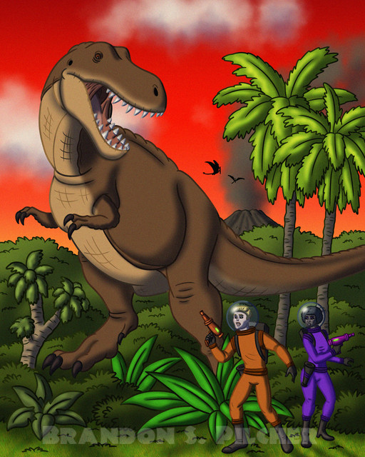 A 1950's Tyrannosaurus eats an astronaut. I sort of wanted this to be like an E.C. Comics cover, while at the same time looking like it belonged in some deranged children's picture book.Related content