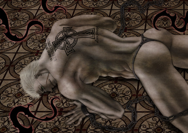 nice coloring..reminds me of disscusions i read on vol.8 about whats gonna happen to him when he stabs himself with the nail. and people were like "ooo hes gonna become jesus!" lamo of course it was just a joke. but this reminds me of that quote