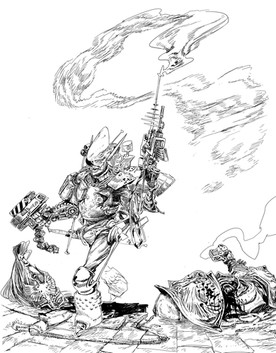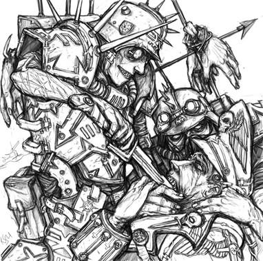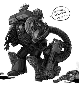 Very creepy. Really ironic that the space marine is calling out a renegade on being 'human', when he's supposed to be defending humanity. Really shows Astartes from the chaos viewpoint, hulking, inhuman monsters with no loyalty to the beings they supposedly protect. Granted, CSM's are probably worse, but at least they're honest about it, and even they have more human emotions than the creepy automatons of the corpse god. Very well done piece.