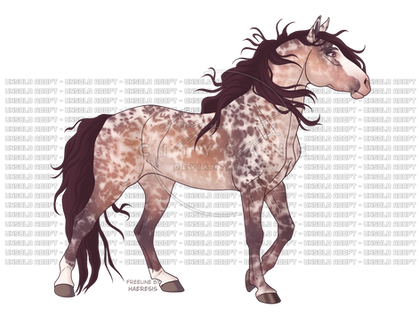 Color: Grey on Silver Pangare Champagne dunskin Roan Sabino Tovero splash Semi-appaloosa (Flaxen carrier)
