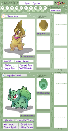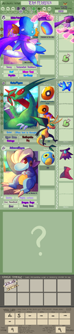 Li'l J: His real name is Harold Johnson. He didn't like Harold, so he told people to call him Li'l J. He is shy and rather unwilling to go into large groups of unfamiliar faces. He is even rather shy about talking to his guild leaders, though that could be expected with Chill (the sunglasses are kind of intimidating to young J). The only Pokemon Li'l J can be truly open to is La'ana, for she has been his best (and only) friend for most of his life. One could look at them, and by the way they kind of idly converse about nothing important, judge them as being closer to acquaintences, but this is just Li'l J's naturally quiet personality. Li'l J often finds himself daydreaming about who-knows-what, but being the shy Pokemon he is, even La'ana is stumped at his response of a heavy blush and a "Oh... I-it's nothing..."