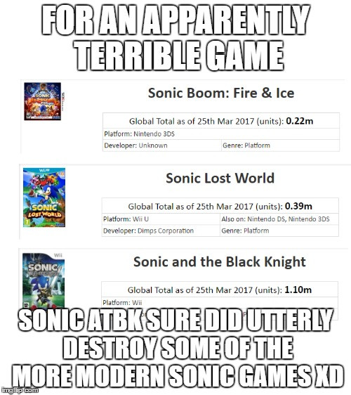 Let's give them one last chance on Mainstream Sonic before we call for their heads, after all, nobody's ever been able to tell me what the ACTUAL problem with the Colors plot was even if they've been able to point out legit problems I couldn't counter with Generations and Lost World (though outside of the ones I mentioned in Lost World, I honestly can't think of one that I'd count as a failing of the writer in Generations since from what I heard, they had PLANNED on a longer story, but Sega kiboshed it).