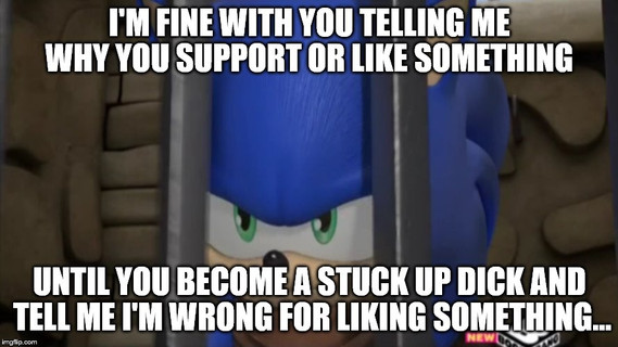 They don't know sonic or the characters, they've been flanderized to hell and back. Sonic became an insufferable douche, with constant jokes. Tails became a know it all, instead of the kind hearted kid he used to be. Knuckles suffered the worst, he became an idiotic musclehead. The dude was pretty intelligent in older games gullibility aside. He was also dutiful and humble.