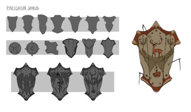 the one on the right was influenced be like old school viking shields, with a bit of a zelda twist!, the center one is a bit more modern, more viking'e'(with a bunch of ruin text around it, and on the forehead of the wolf, that one being a symbol for power). The numbers 4, and 3 scratch marks are just random bramble....