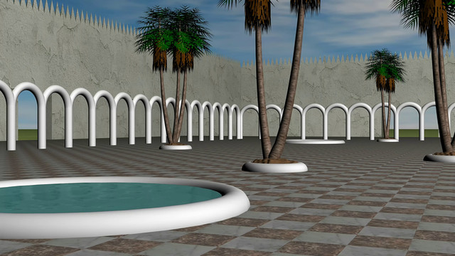 This is an outdoor park area I made in a 3D Modeling program called Rhino. I call this town Monotone Town, because, as you can see, everything is in grayscale coloration. There's a fountain in the center, surrounded by several park benches and streetlights. You can see a grey brick building, along with the never-ending dusk in the background.DO NOT USE!!!!
