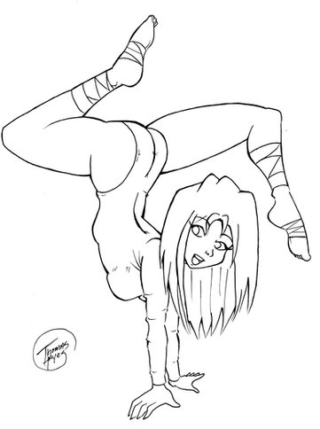 Technially speaking, in this position, Sally's armpits should almost be exposed - the shoulders rotate open as opposed to closed. (nice little rhyme, don't you think? ~.^) This will, with a good acrobat, set the fingers pointing backwards toward her heels, and the palms will always bear most of the weight. Now...I'm a little hesitant about this next point because I'm really not sure whether she's a gymnast or an acrobat. If she's a gymnast, then you're dead-on right with the head position - but an acrobat would pick the head up further, closer to the center of the back.