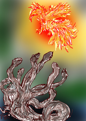 The pose is amazing - so full of movement, action. You can just see it writhing, waiting to strike and bit. I love your version of the hydra! I think the colors chosen are very good as well. The blue beast stands out nicely against the fiery background, but at the same time they balance one another out. Yay for complimentary colors!