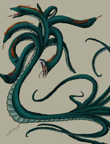 Also, if you want to add more "feeling" to the picture, you sould try to think about the context of the scene. I think that a good place for a hydra would be a dark cavern illuminated by a torch, where it was enslaved with big chains.