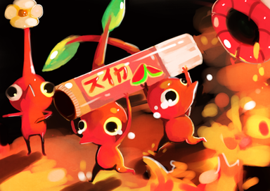 sorry to bother you, but may I ask what program you used to draw this? I'm trying to learn how to do digital painting similar to this, but I'm having a very tough time finding the right brush tools and settings to get a similar look... Would you mind giving any tips for a beginner? I'm having a real hard time with shading, did you use the same brush for the shading on the blue pikmin as you did for its main body color?