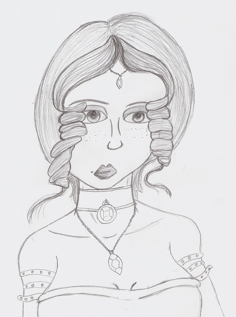Kanille is a delicate naga female with striking blue and green scales and long flowing black hair that reaches her mid-back. Her human-half has beautifully tanned skin, adorned in all kinds of jewlery. She wears nothing more then a cloth wrapped around her breasts and a glolden collar around her neck witha chain coming off it. Her eyes are purple and silver and a crescent moon marking can be seen over the purple eye. She has dainty, curved green horns and elongated, pointy ears.