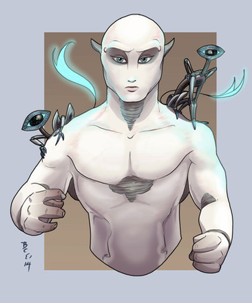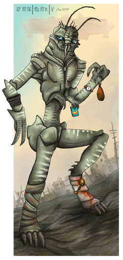 The disease makes his shell extremely brittle so he is constantly seeking out help from his friend Eleanor ([link] that is not Ev there obviously). His antennae are also stunted and therefore practically useless, and his vision and hearing are so-so. He is still relatively normal in height (only an inch or two taller than Christopher Johnson) but he appears very diminutive due to his thinness and delicacy.