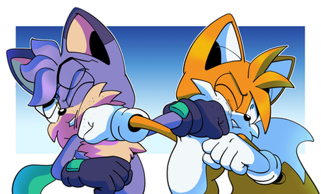 Miles teasing Tails about his possible(?) interest in Cream, regardless of its true or not Tails is not happyArt by