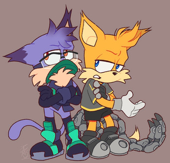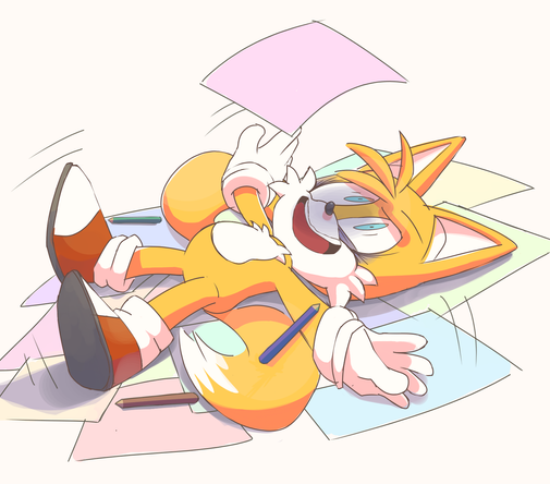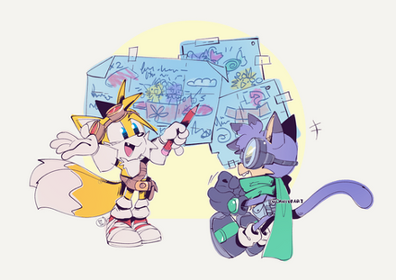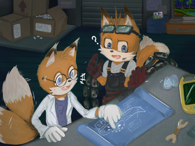 Miles and Tails doing some work in their workshop plotting out blueprints and moving leftover scrapsArt by: twitter.com/PixieFeatherKw3