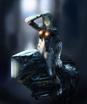 #biggun #breasts #dark #dim #fringe #girl #hose #longhair #makeshift #wind #exoskeleton #powerarmor #scrapmetal