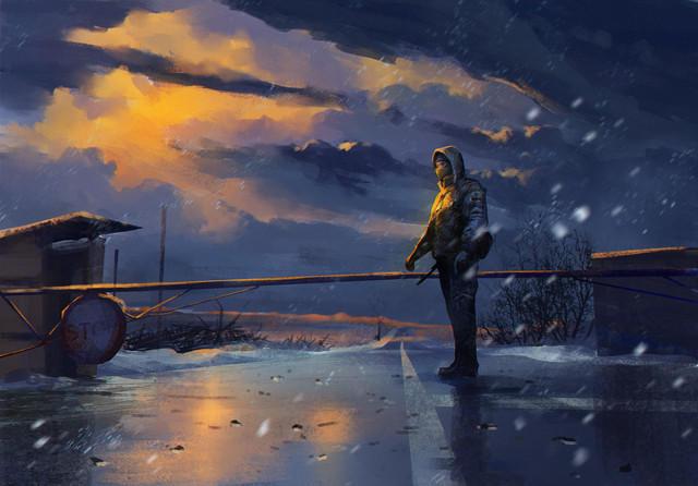 #blue #dawn #driver #morning #orange #person #rifle #standing #truck
