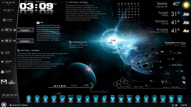 There were a few problems though. Whenever I put the RSS feeds on any of my favorite wallpapers, I couldn't read the text. I used backgrounds on the skins for a while, but it was quite ugly. And then, projectVirus came out with his background skins. So I downloaded them and started playing around. Eventually I ended up with what you see above. The part that took me the longest was the background for HUD arcs, calendar, and notes (yes, it's one background).