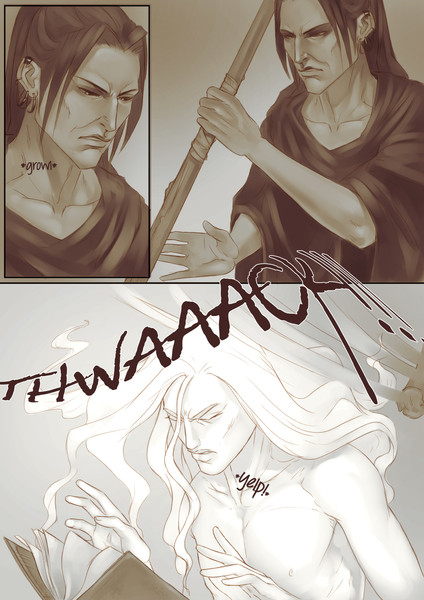 Oh cool, a new page! Tez looks a little bit grumpy to me. I'm guessing that he was spying on a certain kissing scene from a few pages back.