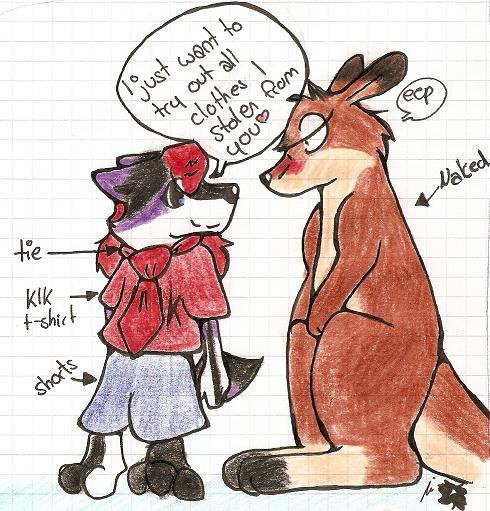 When I saw the tittle, I -knew- it was going to be Sublime. Hell yes. You are getting so defined in your style of drawing, especially with hands, feet, and the incredible FLUFF. I love Leahs "OH NOOO!!" face! You captured it perfect with the situation. also the anatomy. kicks. ASS. for serious. Crows butt is sooo delicious. I also like the shape of her snout through her hair. And the outlining in words is awesome. I love you so much, it makes my wee heart so happy to see your art!!