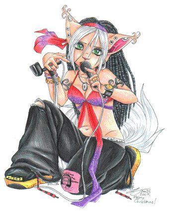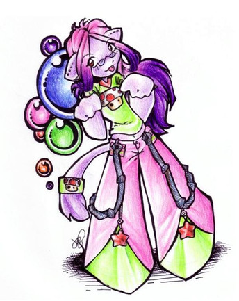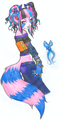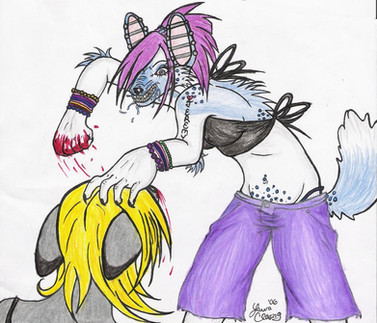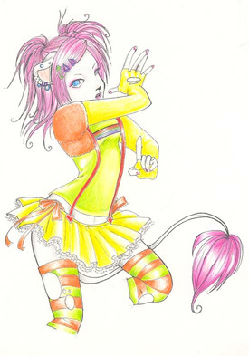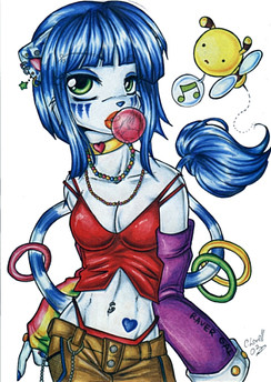 RIGHT IN THE KISSER!!I am not very satisfied with how this came out. I absolutely KILLED it with the inking and the colouring. And her head is too big for her body. And it's situated a little awkwardly on her neck. >:[ I fucked this up. Otherwise I kind of liked it to start with. The colour scheme sucks ass too. I got a little carried away with it because I wanted to play with my limited markers. But whatever. I hope Kibby like it anyhow.