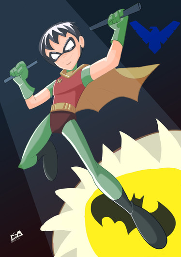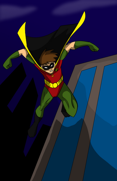 ~TEENTITANSFANI have done Starfire and now Robin! I am going to be doing all the Titans so hold on they are comming soon! I think I did a better job on Starfire than Robin. The sky is still the same but Robin's is Blue and Starfire's is like a magenta color. Robin is supposed to be running down a hill chasing Slade. In this Pic Slade is not dead yet. So I hope you like this pic.