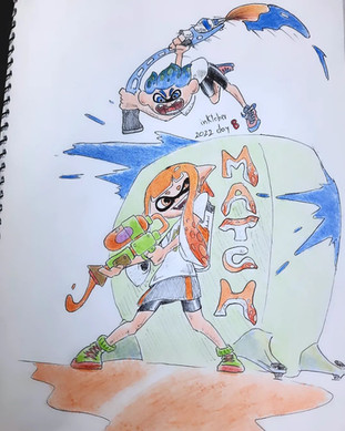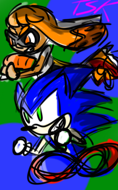 abslutely love the contrasting orange and blues! your super saturated colors and thick bold line look really good and help make them pop off the page! the expressions are hilarious too, never seen an inkling look quite so menacing, or sonic so terrified