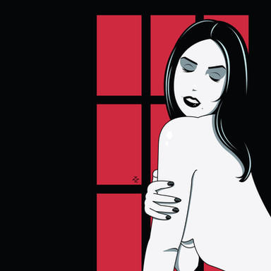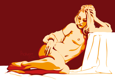 First off I like the composition and simplicity. And I love the red. It really stand out like her eyes. The anatomy, especially the hands and legs is really well done too. Great Job.
