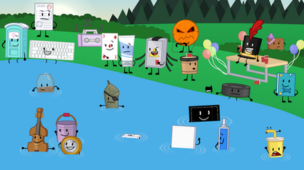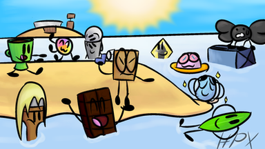 this took me a long timeKnowing that this would be the last day on the cruise, License Plate found it appropriate to throw an outdoor beach party! (or just in the water at least). He built a deck and shelved it with food and refreshments, he strung up decorations (There were a lot more than in the picture, im too lazy to draw them but there were party poppers, banners sticking out of the water, confetti, streamers, and stuff like that). When it got dark, he brought everyone back onto the cruise, and they play games that resemble previous challenges (like hide and seek and paintball).