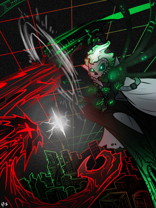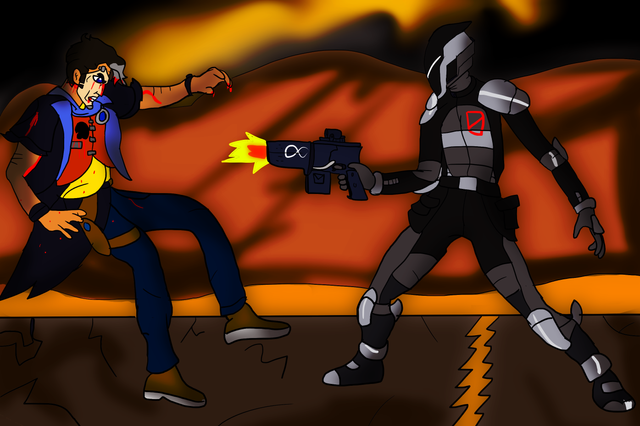 This artwork was long overdue. Thanks to me being me, it was lying in my stash with so many other things. Gathered the courage to finally color and shade it today.Felt like drawing yet another videogame-like scene, and now, I'm pitting DMB against his mentor/icon: Alex Mercer himself! I was inspired to do this after me and a friend of mine discussed a possible Prototype 2 rp 1-2 years ago.