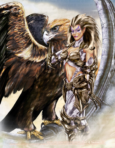 I tried to pick up her character and looks by adding ornamental tattoos on her body, her "crown", her upper hairstyle and of course her weapon.