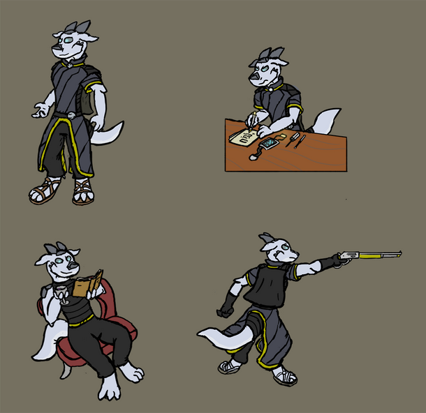 Reference sheet commission for 's Colkheta (alien) character, Rook! This fella was a fun character to design. I was given certain specifics to follow (eg. yellow fur, stripes, lion tail, shirt/shorts, sword), but the rest was left up to me. I really like how he turned out.