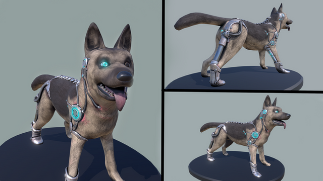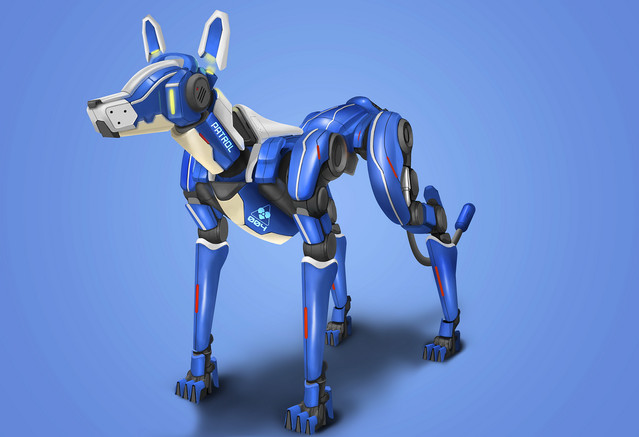 Here is the robot that I've been working on for almost a month, all completed! We had to add some extra detail shots of him, so I decided to make my presentation sheet into a fake repair log for some futuristic company. x) I feel the logo I designed for this came out pretty snazzy too!The DogBot is essentially a friendly service robot. For what services? I'm not sure. I suppose it's a loyal creature, so it'd be willing to do many tasks. I painted him blue to have him come off less threatening. I also made him look rather beat up (like hanging wires) to make him look more interesting.