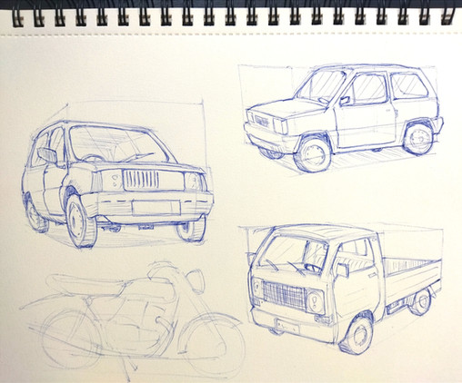 Try to draw cars from the angle I did here! It makes them look way more natural - since we're used to seeing cars from that angle when walking around. If you draw them from above, like a habit I used to have before yesterday, it's a lot harder to make them look believable.