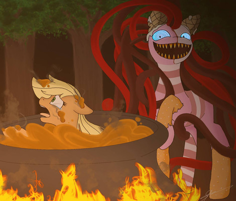 #cauldron #apple #commission #danger #food #forest #hat #rope #stew #my_little_pony #friendship_is_magic #daring_do #fire