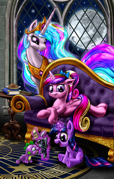 In the background, I wanted to include some nice landmarks, and subtle things. The left and right windows representing her homes in Ponyville, from humble beginnings, to major growth as she takes on bigger roles in her life. The center window, representing the light and guidance of Luna and Celestia on her journey.