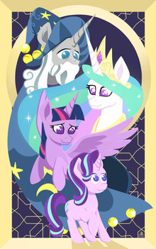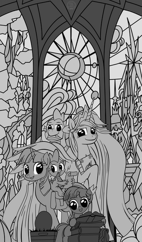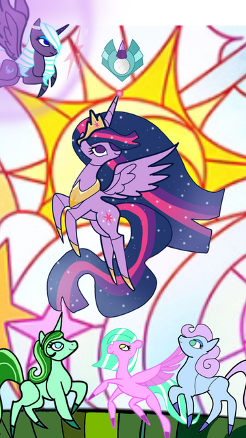 This image was first created through a Derpibooru event, that was to celebrate the final episode of My Little Pony: Friendship Is Magic. It was first posted as a black and white version, that way I at least had something posted for the event (I got a neat badge for it), followed by this being on the back burner for a while, until now! Any way, I came up with this idea, of Twilight throughout the series in a way. From Filly, to pre-alicorn Twilight, to the now ruler and princess of friendship. Our adorable book horse has come a long way through the 9 seasons we’ve been with her. I’m proud of her for the accomplishments that she has made in the show.