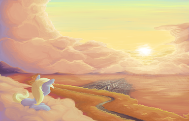 I am loving this artwork of good old Derpy Hooves and our favorite place of the show, Ponyville. The details are pretty cool here. The clouds and the surroundings of Ponyville geography wise make the place look realistic. The background (power lines, water tower, the houses, the birds, the clouds and the mountains) brings you a sense of enjoying a fresh day with Derpy alongside the bird on her wing and a muffin in tow as well (her ultimate favorite). Really, I can't stop looking at this and think of the bright days that are ahead for Derpy and the town as a whole.